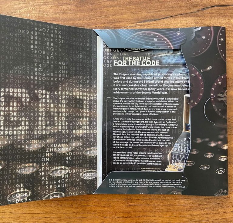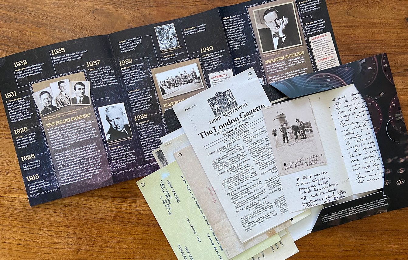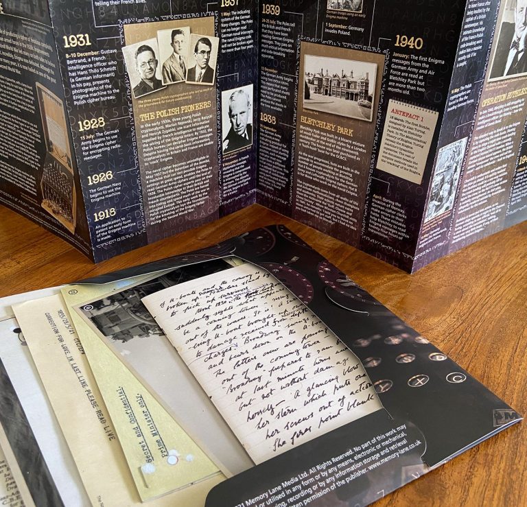 Enigma – The Battle for the Code is an original pack devised and produced by Memory Lane. The pack contains authentic reproductions of top secret letters, telegrams, reports and photographs, together with an exclusive timeline document charting the events of one of the most extraordinary feats of the Second World War.