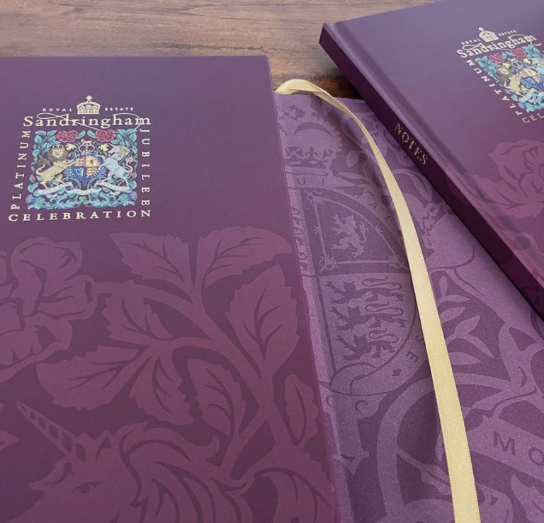 Sandringham Platinum Jubilee hardback notebook, with printed endpapers, foiled details and gold ribbon.