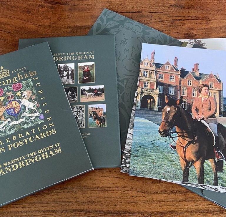 A wallet-style postcard pack designed for Queen Elizabeth's Platinum Jubilee, celebrating her love of Sandringham. Produced as part of a wider gift range by Memory Lane, this pack holds up to ten postcards.