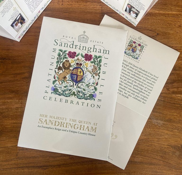 To celebrate the Platinum Jubilee of Queen Elizabeth II, Sandringham Estate approached us to produce a commemorative gift range using their Sandringham Jubilee crest design. Among the outcomes was 'Her Majesty The Queen at Sandringham', a concertina-style timeline which told the history of the late Queen's love of her cherished country home in Norfolk. Originally sold in the Sandringham gift shop and at their ticket desk as a guide to the Jubilee exhibition, the souvenir publication is now a collector’s item and records a special moment in time before the passing of Queen Elizabeth II.