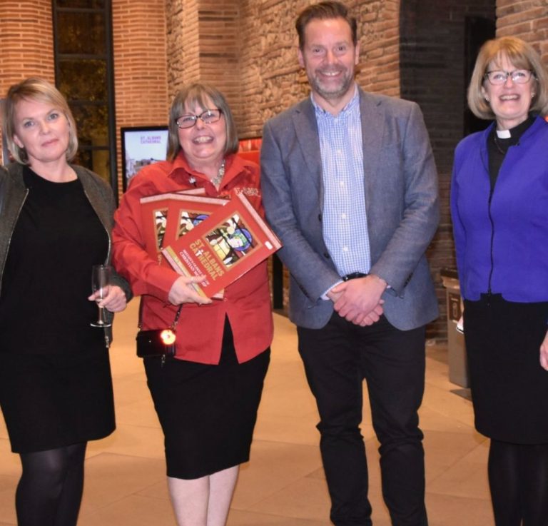 Louise and Andrew of Memory Lane Publishing celebrate with cathedral retail manager, Sharon Wood, and the Dean of St Albans, Jo Kelly-Moore.