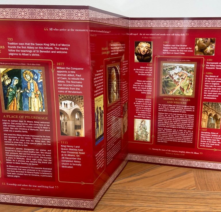 St Albans Cathedral have a permanent timeline installation within the entrance to the Cathedral giving visitors an instant picture of the chronology of the building. The way visitors engaged with the installation prompted the Cathedral’s retail department to approach Memory Lane with the task of converting the timeline into a more in-depth 'take home' version. We then devised and produced a 10 page concertina style, fully illustrated timeline for sale to Cathedral visitors.