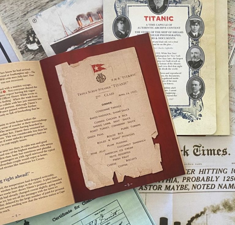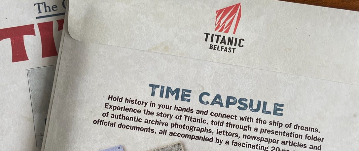 The Titanic Time Capsule is an original pack devised and produced by Memory Lane and adapted for sale to visitors exploring the award-winning museum Titanic Belfast. Containing authentic reproductions of letters, maps, tickets, photographs and newspapers, the pack also includes a 20 page booklet telling the fascinating story of 'The Ship of Dreams'.
